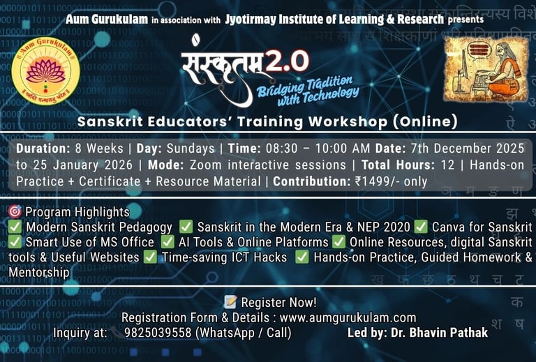 Sanskritam 2.0 is a unique teacher-training program designed to empower Sanskrit educators with modern digital tools and creative pedagogy. It blends timeless Sanskrit wisdom with today’s technology to make teaching engaging, interactive and efficient.