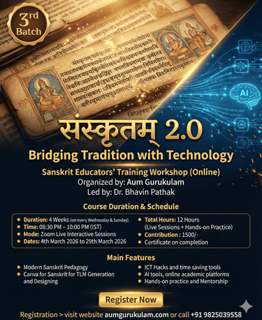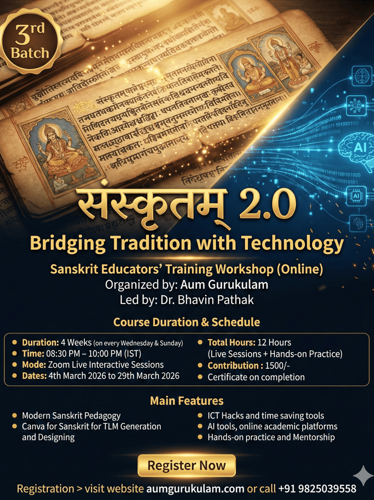 Sanskritam 2.0 is a unique teacher-training program designed to empower Sanskrit educators with modern digital tools and creative pedagogy. It blends timeless Sanskrit wisdom with today’s technology to make teaching engaging, interactive and efficient.